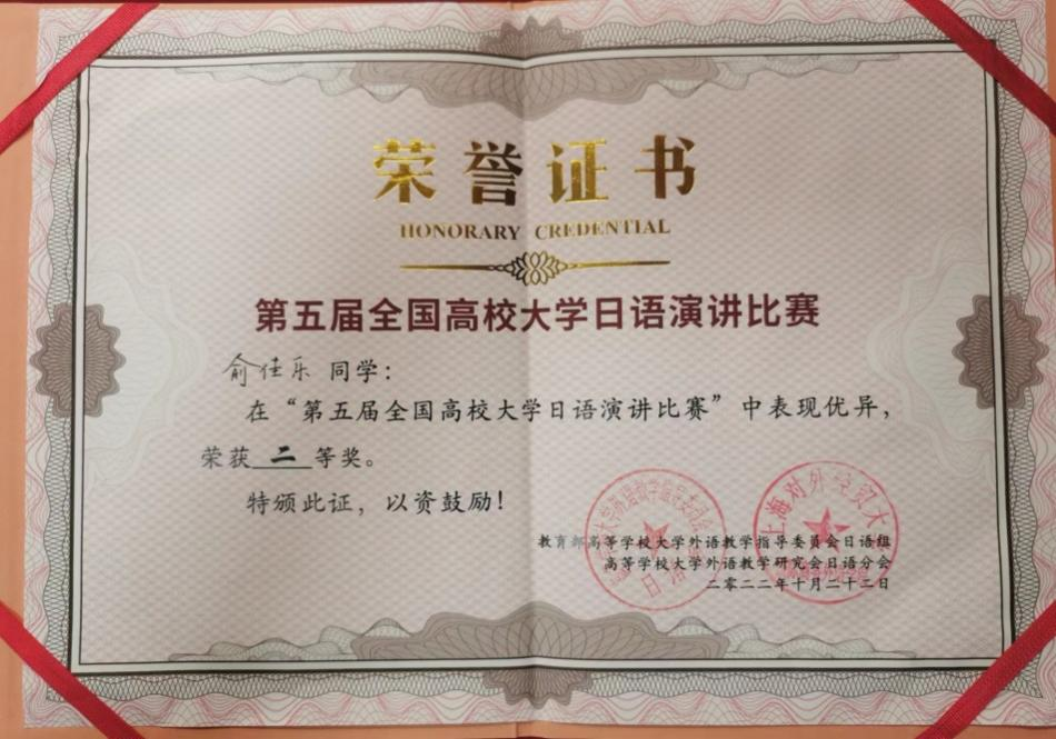 第五届全国高校大学生日语演讲比赛决赛于10月22日在上海对外经贸大学举行,我校港口与海岸工程学院工程管理2113班俞佳乐同学在本次比赛中荣获二等奖。